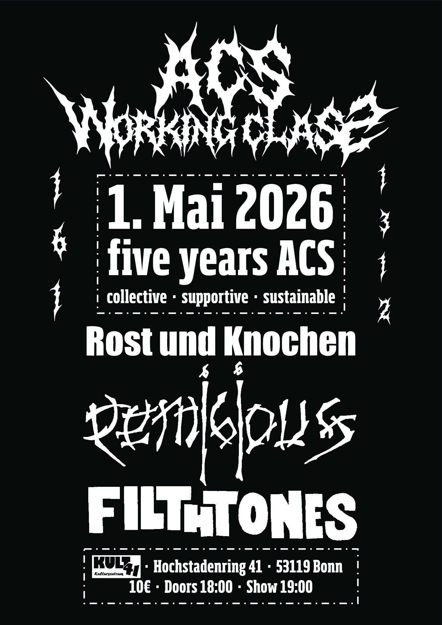 Fünf Jahre ACS – Soliparty für euren kollektiven Lieblingscopyshop im Kult 41 in Bonn. Bands, Drinks und Merch vom Allerfeinsten.